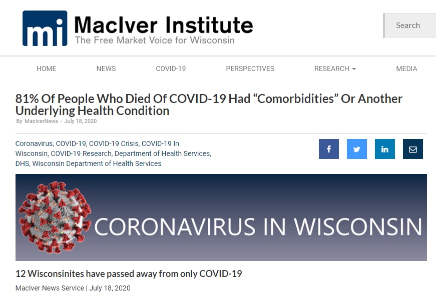 Per Maciver, 12 have passed away with no “comorbidity” (WI DHS describes this as cancer or diabetes primarily) 146 were undetermined, and 675 had this “comorbidity”. Note that age cannot be a determining factor of “comorbidity”.