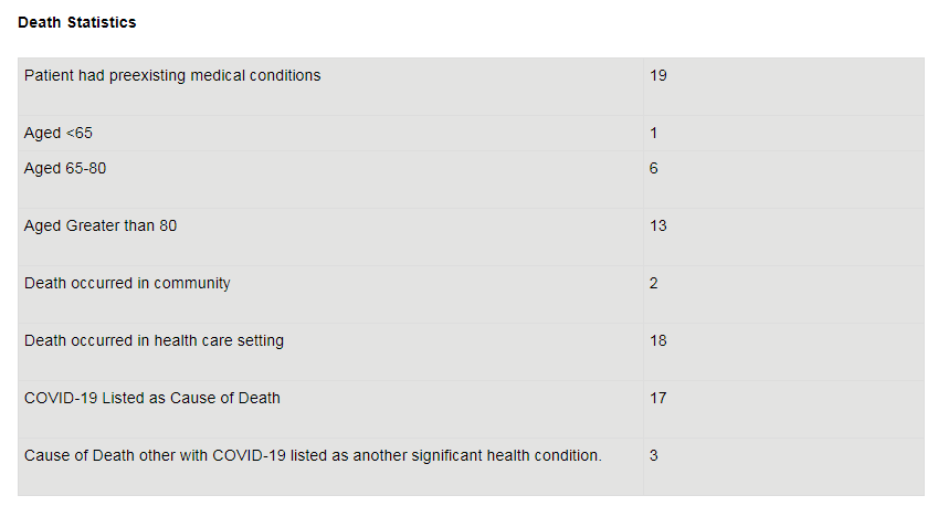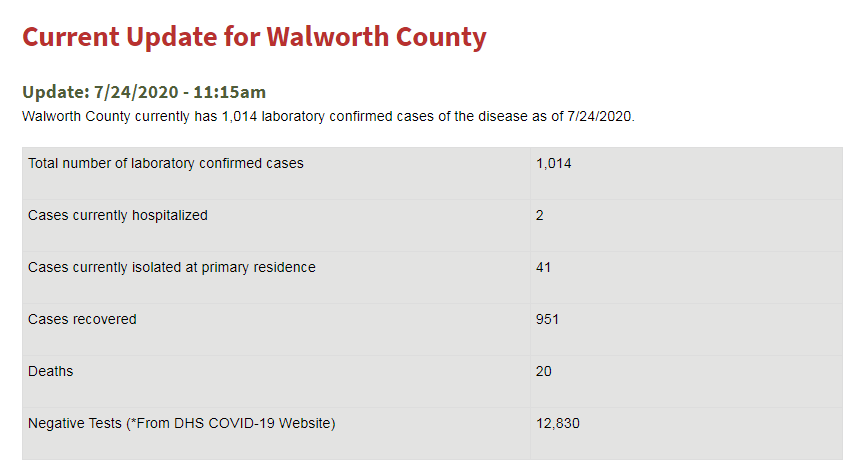 20 deaths in Walworth county. Nineteen had pre-existing conditions. My source (yet to be confirmed) is that the one case without pre-existing conditions was over 70 years old (no diabetes or cancer).