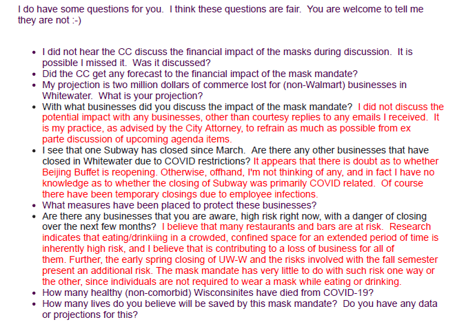 - The talking point I expected … that the statewide mandate will nullify any effect on businesses. I interpret his argument as a reference to going to Elkhorn for dinner instead of staying in Whitewater. Not considered was just staying home. Also, the Whitewater mandate goes thru the election until Jan1. Evers mandate ends in September (barring inevitable intervention from legislature or Wisconsin Supreme Court)…
