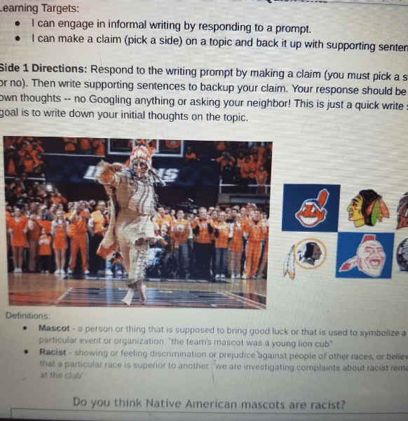 Bottom Line Up Front – I want to make the point that mascots are not in the least bit racist. I want to set up for future homework assignments. I also want to make the point that this topic should not be discussed in schools in terms of racism.