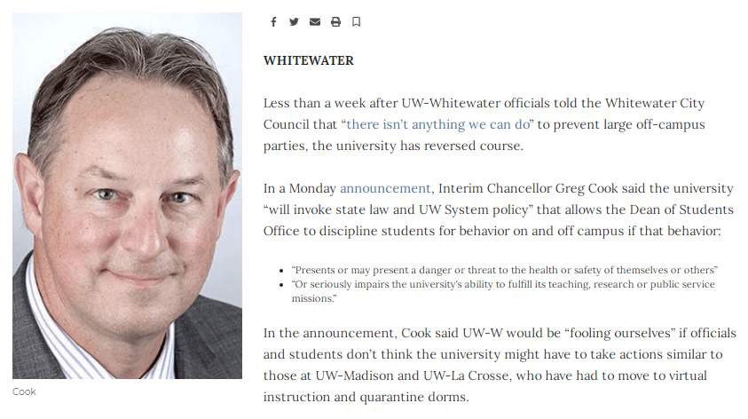 One of the points during the fear mongering by the statists was that Whitewater (paraphrase) has more students per capita than other Wisconsin universities. And the Janesville Gazette does their part with an article to support just a few days later: