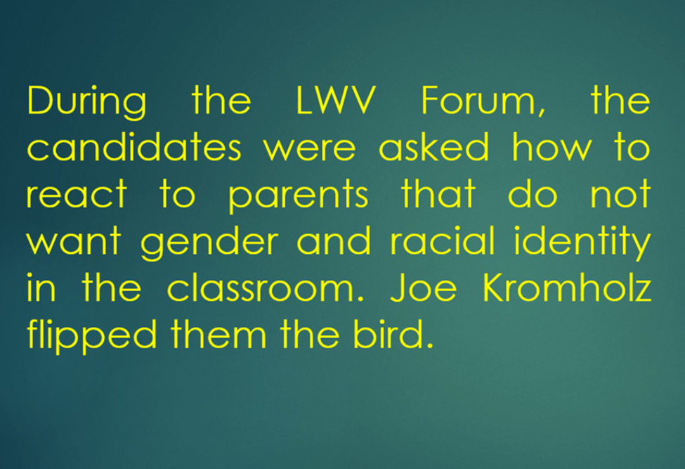 - Joe Kromholz made a comment towards the end of the LWV forum that <conservatives> are “upset that they can’t announce their bigotry anymore.” My takeaway (my opinion) from this is that Joe does not really want to work with people on the school board. The comment is simply so drowned in ignorance and pride. I grow tired of this hyperbole. I cannot imagine Thayer Coburn or Miguel Aranda making such a comment. Kromholz has tied his candidacy to more of the same. Sorry, Joe, but this trajectory is not in line with what I want for my kids.